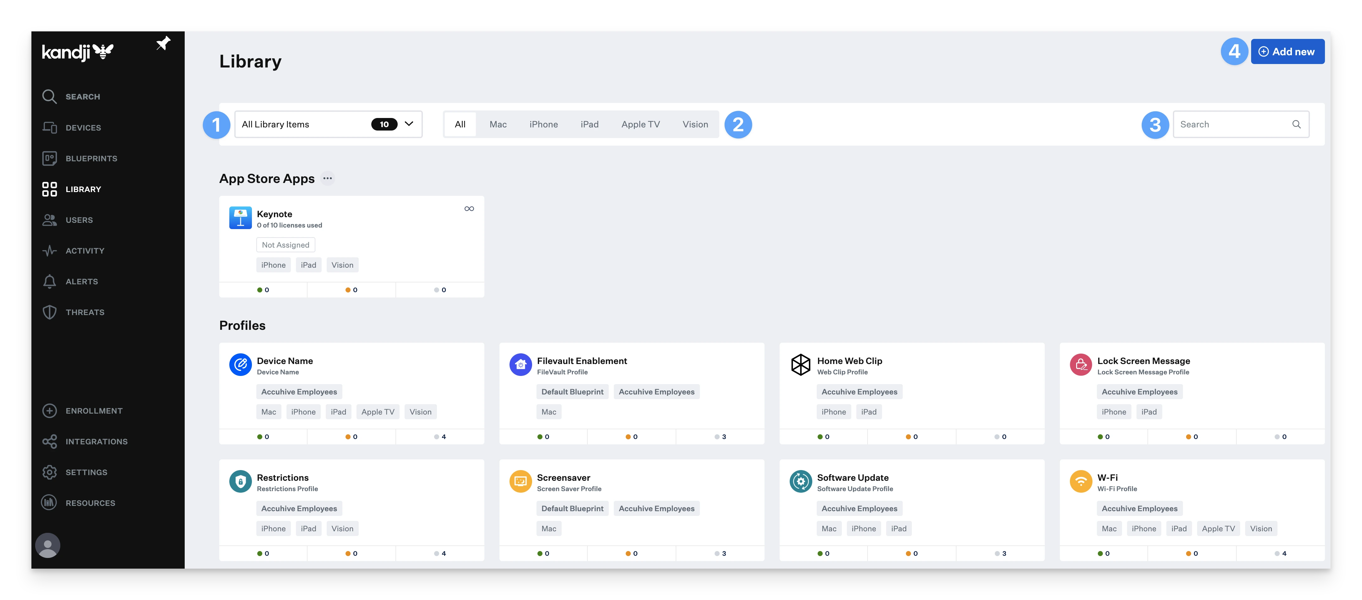 Kandji allows you to remotely manage devices across your company — including installing apps, enforcing security settings, monitoring compliance, locking or wiping lost devices, and automating updates — all from a central dashboard.